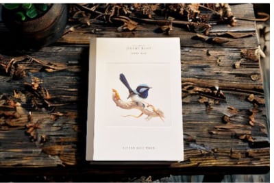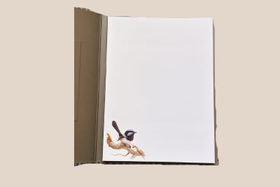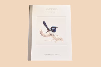 オーストラリアの野生動物アーティスト、ジェレミー・ブート(Jeremy Boot)によるアオミソサザイのイラストが描かれたノートパッド。繊細で精緻なパステル画で、花咲く枝に止まる小鳥たちの愛らしい群れが描かれています。